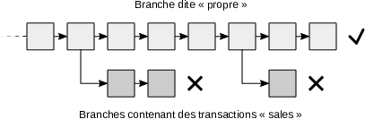 Cependant, cette situation peut devenir autrement plus grave si les mineurs conformistes, à savoir les mineurs suivant méticuleusement les réglementations, commencent à refuser les blocs contenant les transactions « sales ». C’est ce que nous appelons ici la censure active, qui consiste à empêcher des transactions d’être confirmées en rendant orphelins tous les blocs qui les contiennent. Pour être maintenue dans le temps de manière certaine, elle nécessite de disposer de la majorité de la puissance de calcul du réseau : il s’agit donc d’une attaque des 51 %. Les branches faibles formées par l’attaque de censure sont mises de côté en vertu du principe de la chaîne la plus longue, comme illustré sur la figure 9.1.
